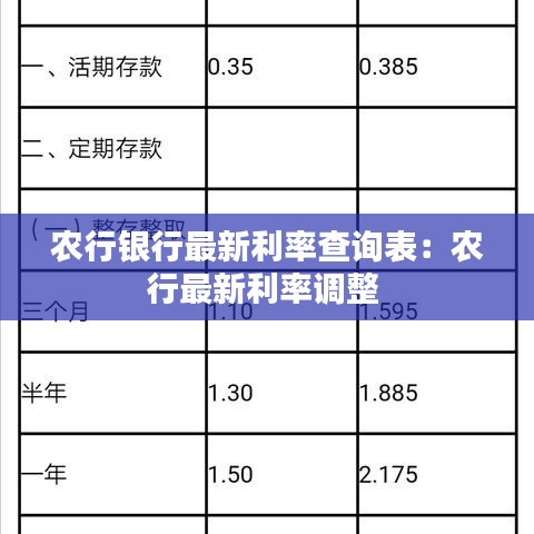 农行银行,全称中国农业银行,是我国国有五大商业银行之一,拥有广泛的客户基础和强大的金融实力。为了满足广大客户的金融需求,农行银行定期更新各类金融产品的利率。以下为您呈现农行银行最新利率查询表,帮助您了解最新的存款、贷款等利率信息。
